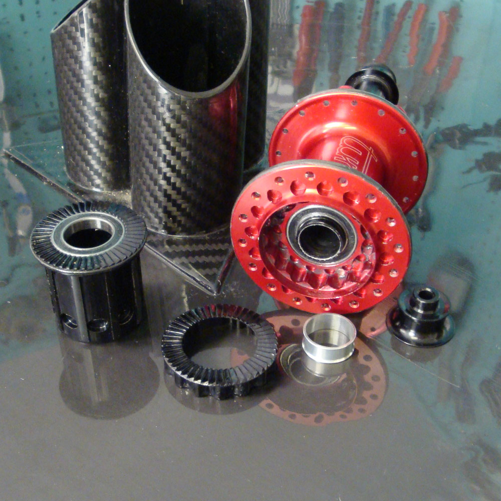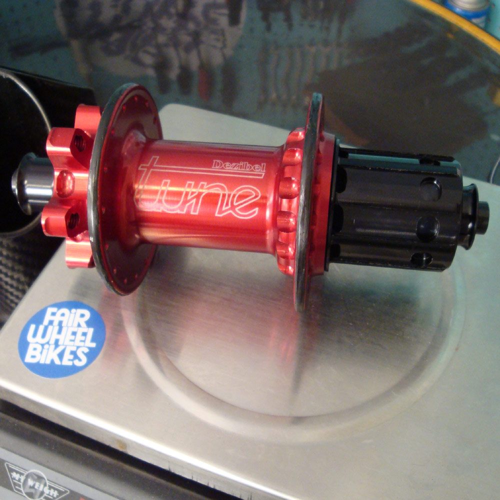 For the rear hub, we had to call in a big favor. Our friends at Tune provided us with a Prince Dezibel rear hub. Taking what will already be the lightest hub rear mtb hub in the world when it hits the market later this year, and doing just a little tuning in the bearings resulted in an incredible 145.9 gram rear hub. The Dezibel is a big departure for Tune from their traditional pawl hubs, but the new design is what allows such large weight savings. Taking a ratchet system design similar in concept to DT or Soul-Kozak but simplifying it down has really made a difference. Rather than using two plates that are separate pieces to engage, they use only one plate made out of hardened alloy and the second plate is machined as part of the free hub body. In place of springs they use magnets with like charges to repel each other. The hub is really quite an engineering feat. I continue to be impressed with how Uli and the guys at Tune continue to push the envelope and slowly whittle away at the weights.