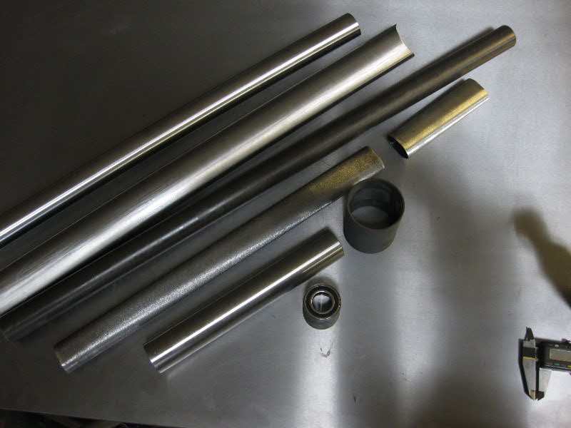 In the photo of the frame tubes,  from top to bottom we have S3, Columbus Aero, Straight gauge seattube (still a lot of work to get this tube butted and shaped) and then some ovalized chainstay and a headtube stock.  The size of the stays and downtube make the 1.125″ headtube look a little small to me.