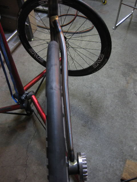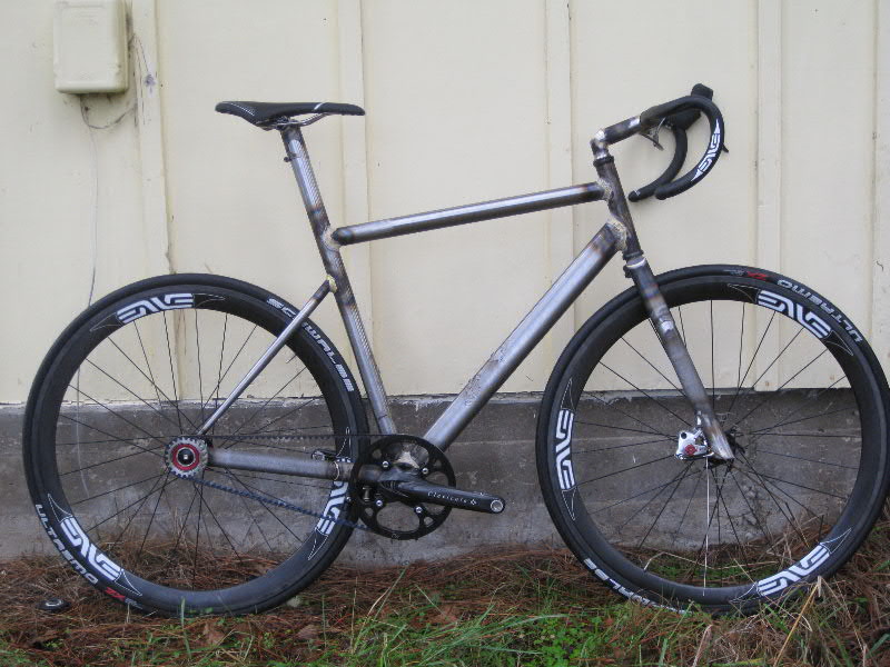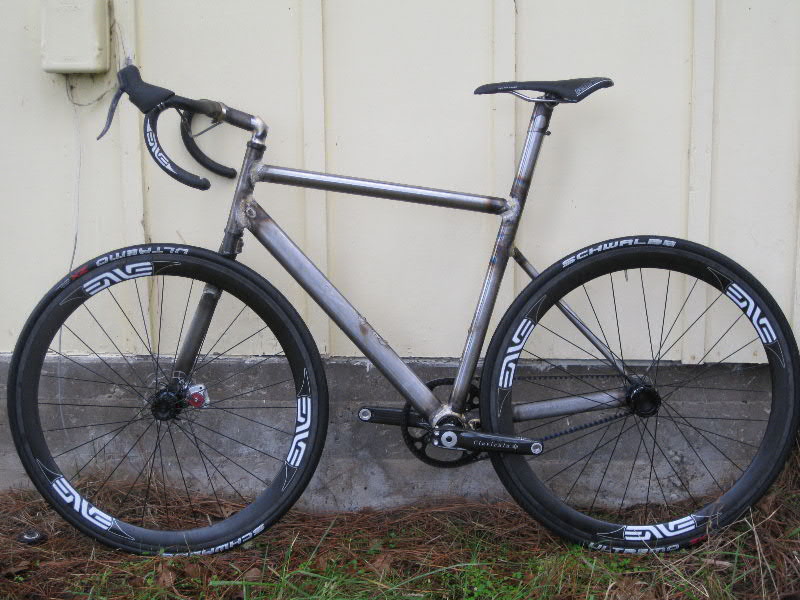 Working with Rob English is always a tremendous pleasure, not only is he a talented builder but delivers what he says he will, when he says he will. That’s a true rarity among custom frame builders. So now I get to present the completed, though certainly not finished, project: Right. Again just a photo update, we still have some really special touches to add. The build list is still finished drawing from both the road and mtb communities. Next a base coat has to be chosen and sprayed so that it can go off to artist Geoff McFetridge for some hand painted awesomeness and then back to the painters for finish work.