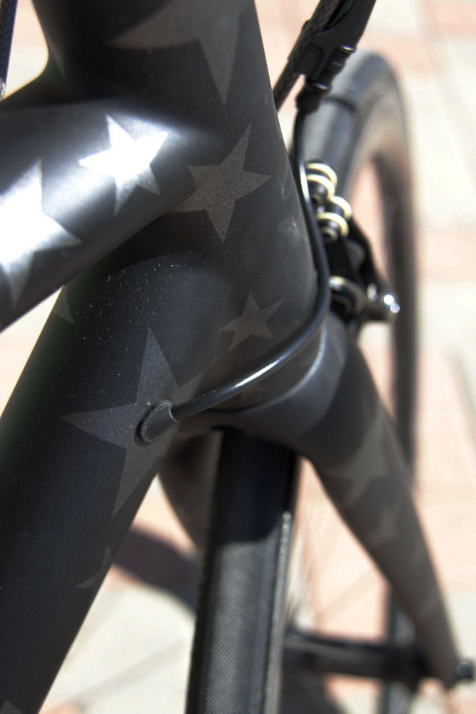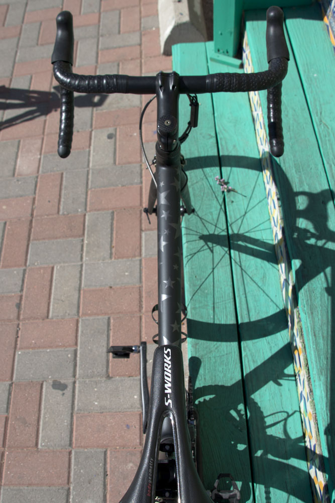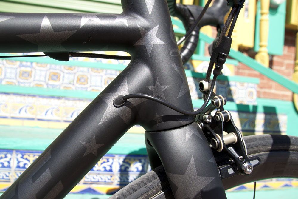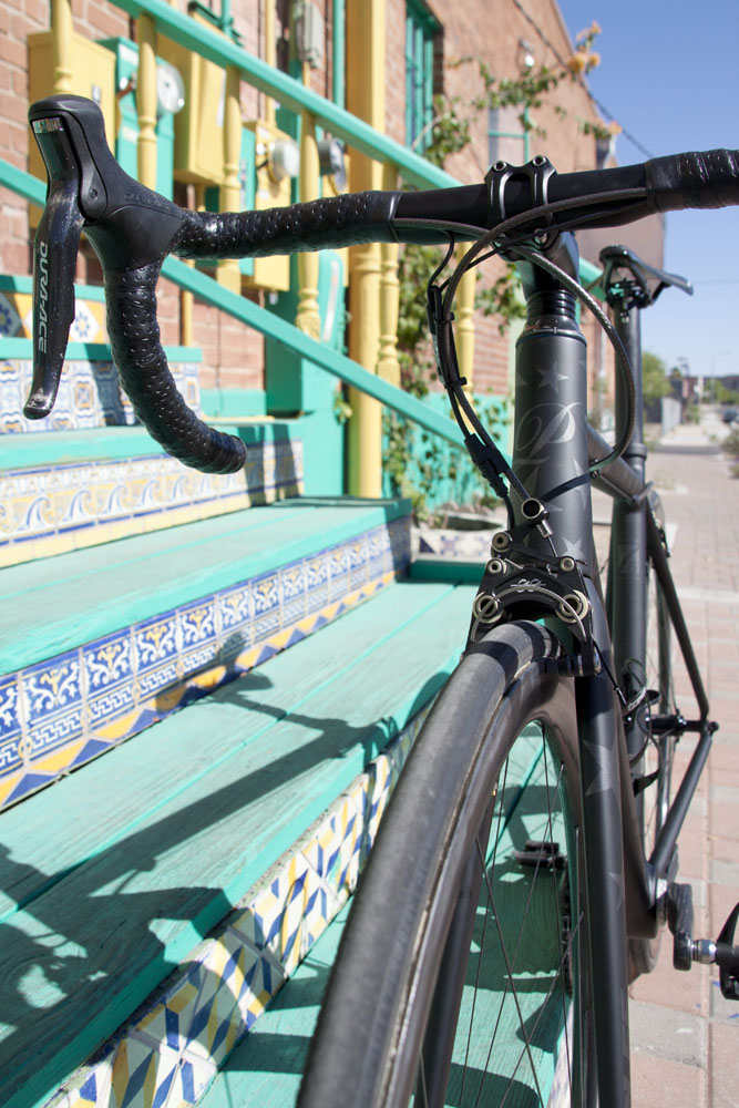 An exotic group of parts adorn the bike in a unique configuration to suit our customer. Black is the new black. The Clavicula crankset was specifically arranged with a compact spider and super stiff Praxis chainrings. Tune Mig 45 and Mag 170 hubs were laced to the new Smart Enve System (SES) 3.4 tubular rims, which in this case provide a perfect balance of aerodynamic stability and weight. The logos on the Enve bar and stem combo were removed, and the frameset itself was custom painted with stars, which are only caught in the right light; a unique design you rarely see on a bike. The aesthetics as a whole were focused around the look of the Parts of Passion laser logo seatpost, emitting that murdered out, stealth appeal. The Z5 SLi frameset is specifically designed with wire access for the Shimano Dura Ace Di2 group, leaving out any frivolous cable stops. Weighed as shown, the bike is right at 13lbs, while our customer’s ultra lightweight Enve 1.25 wheelset drops it another half-pound.