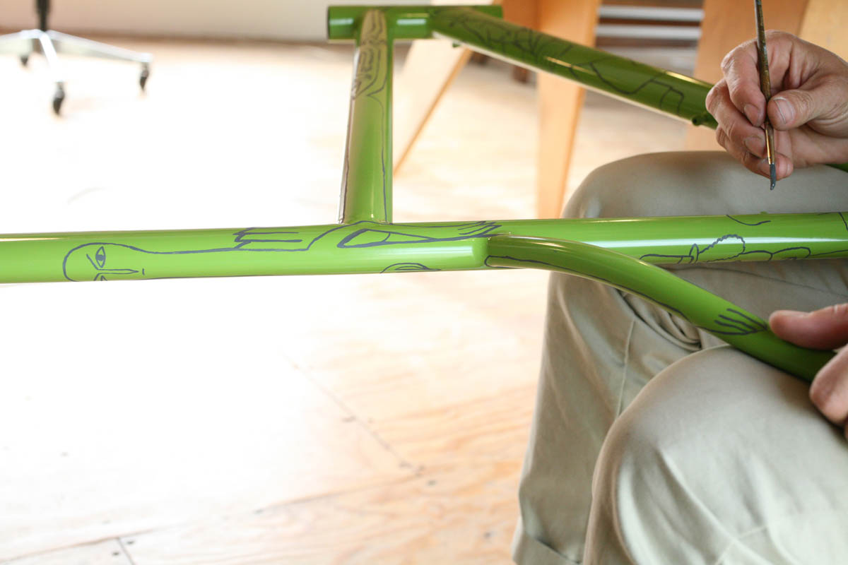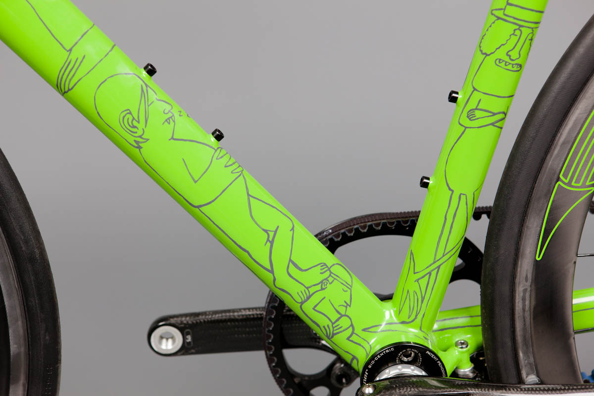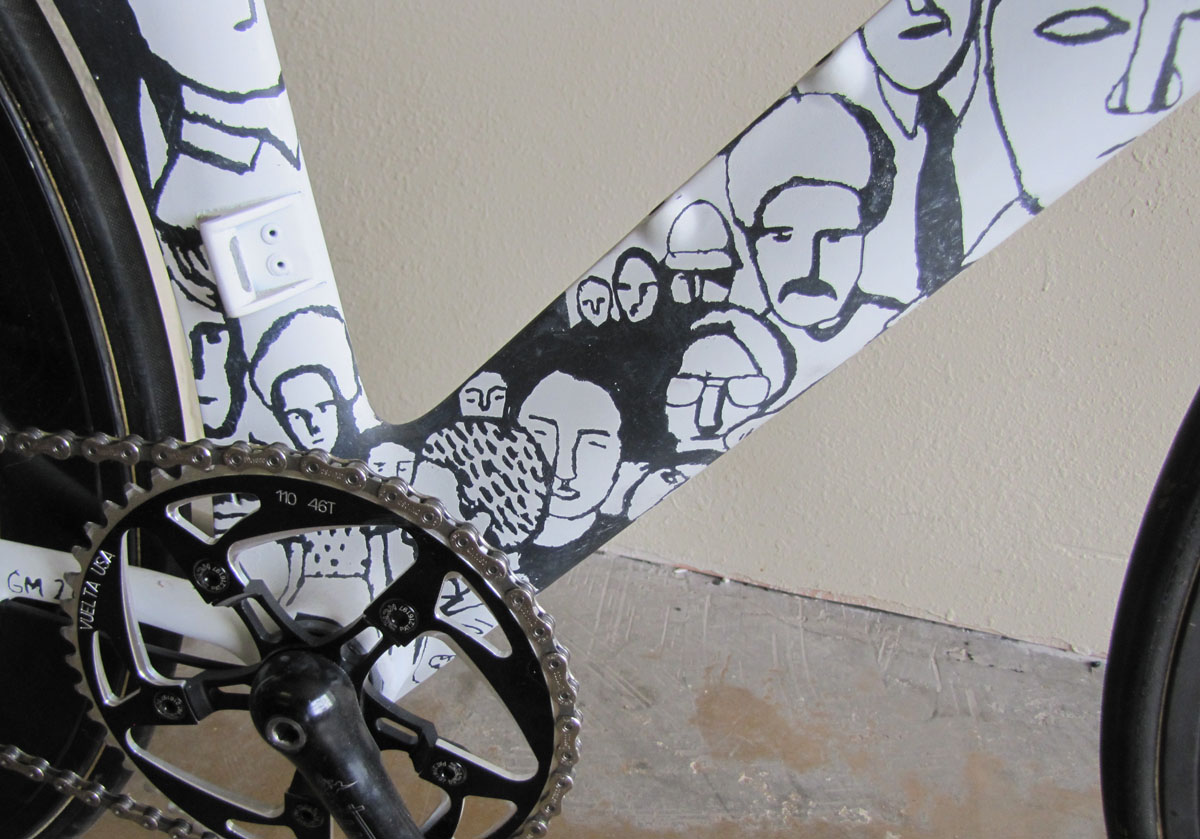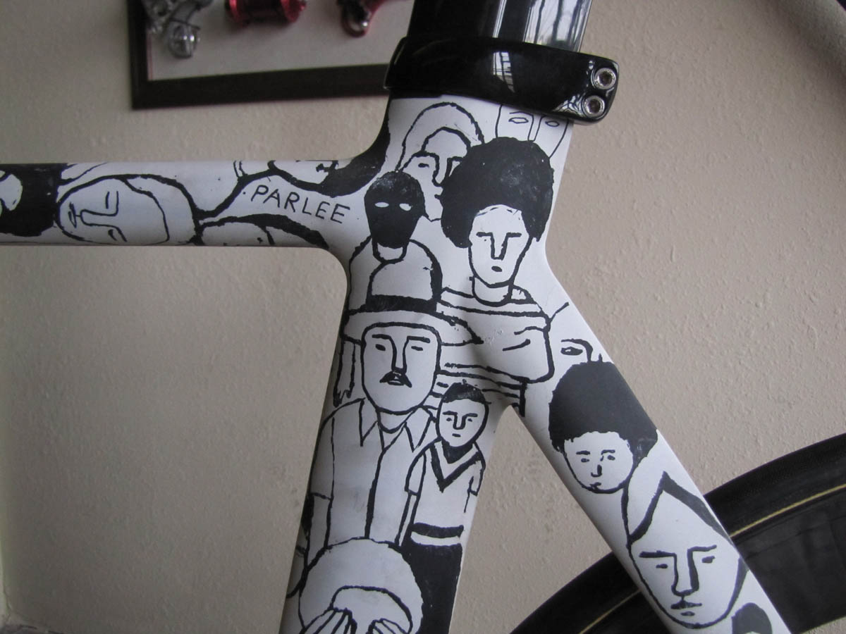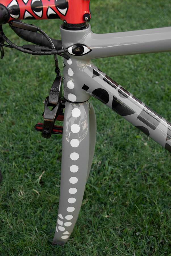 This week someone had asked me to pick some of my favorite project bikes and send them more detailed photos. In thinking about this I realized 3 of my 5 top choices had one thing in common, artist Geoff Mcfetridge. Not too many people get to work with such an awesome artist and I feel lucky that I’ve been able to work with Geoff on 3 projects so far, and hopefully another chance will come up in the future. If you aren’t totally familiar with his work, I’d suggest clicking this link and taking a look. Since we’ve now taken some new photos and pulled some never before seen ones from the archives it seemed like a good idea to share them. I’ve tried to use mostly detail shots that focus on the paint rather than the complete bikes. So without any more delay on to the pictures.