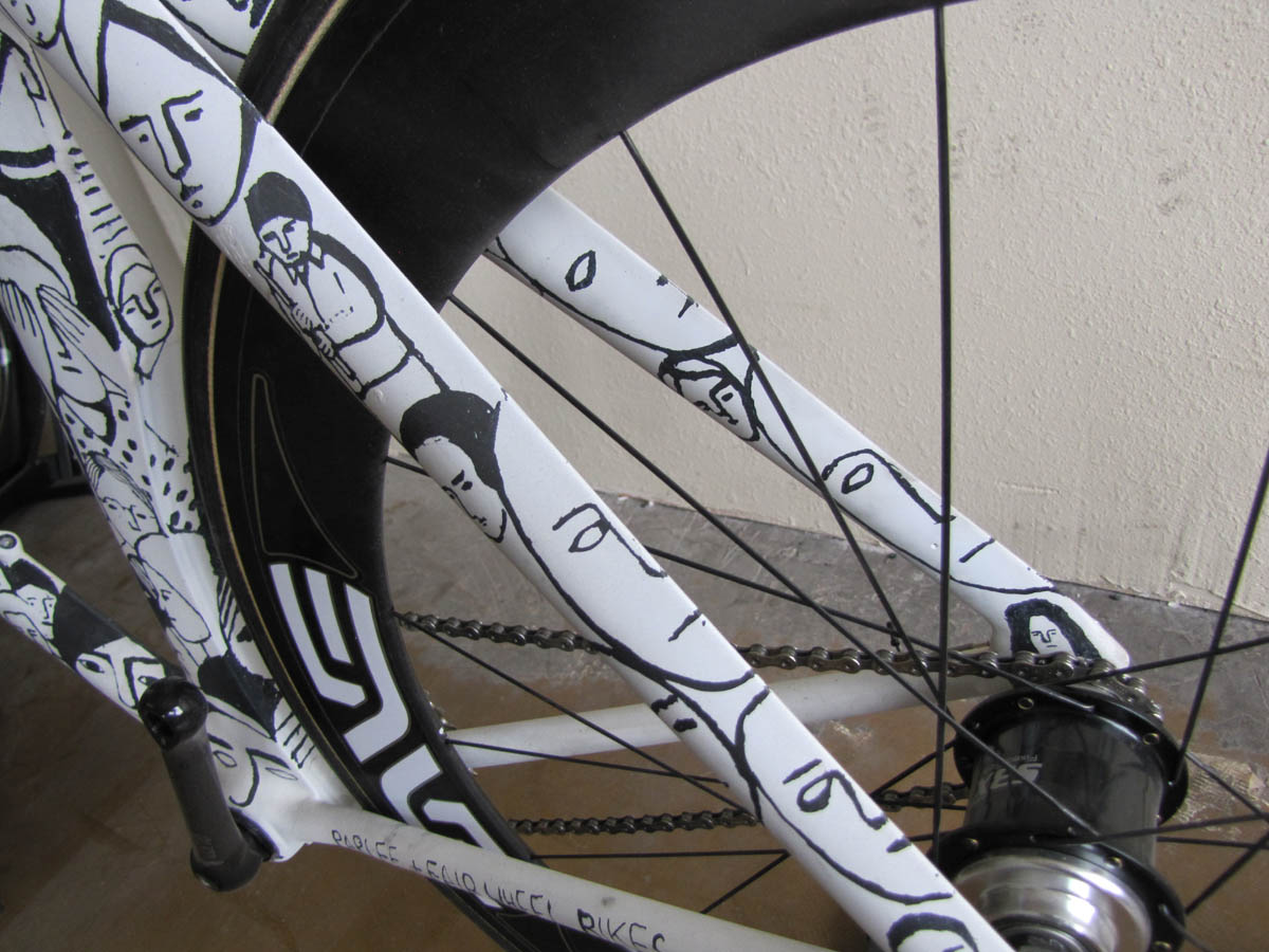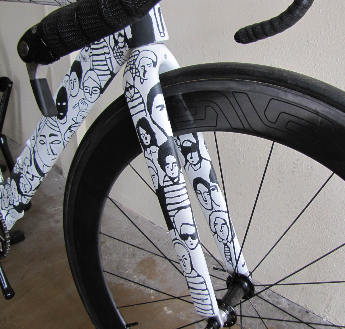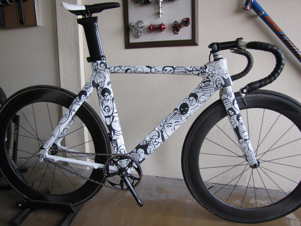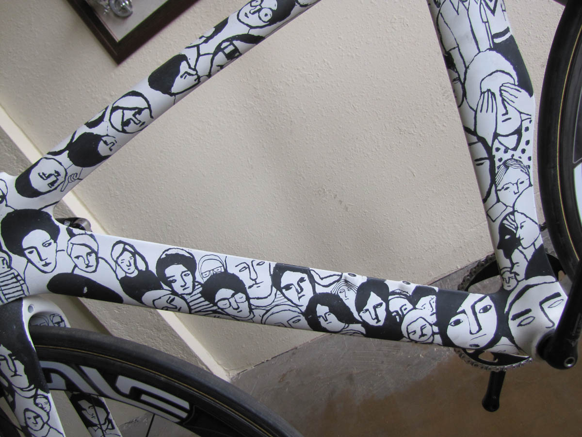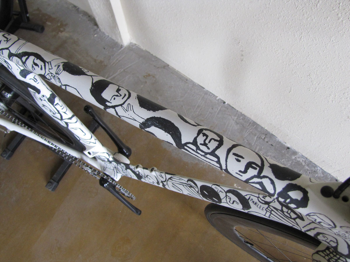 This week someone had asked me to pick some of my favorite project bikes and send them more detailed photos. In thinking about this I realized 3 of my 5 top choices had one thing in common, artist Geoff Mcfetridge. Not too many people get to work with such an awesome artist and I feel lucky that I’ve been able to work with Geoff on 3 projects so far, and hopefully another chance will come up in the future. If you aren’t totally familiar with his work, I’d suggest clicking this link and taking a look. Since we’ve now taken some new photos and pulled some never before seen ones from the archives it seemed like a good idea to share them. I’ve tried to use mostly detail shots that focus on the paint rather than the complete bikes. So without any more delay on to the pictures.