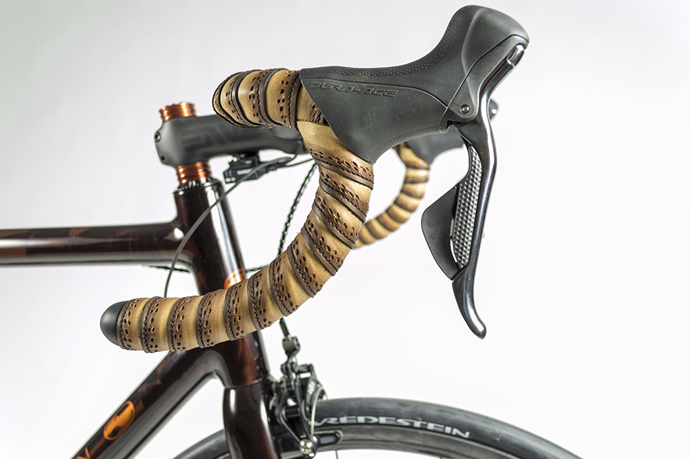 The unorthodox finish on this Crumpton really is something you have to see for yourself. There’s a depth to the paint that you can only see in direct sunlight, the photographs really don’t do it justice. Contrasting colors and finishes don’t usually work together as well as they do here, matte carbon and leather combined with copper anodized aluminum make this look like a cowboy’s steed.