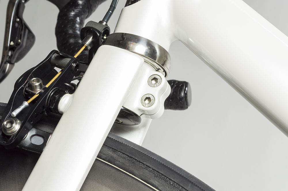 This build is bound to ruffle a few feathers, especially the deep section rims on a thin-tubed steel road frame. Rob English has applied his unique vision of what an aero road bike should be. Small, but complicated touches like the inverted fork/stem arrangement and integrated skewer ends reduce drag in little ways that add up to make a big difference. The steerer tube extends down from the stem, and is clamped at the fork crown. The top cap applies pressure to the headset from underneath. This allows the cables and wiring to be routed through the headtube for a super clean front end. You can find the junction box tucked under the saddle. A carbon tube takes the place of a normal seatpost. Even though its such a polarizing build, I think the contrast makes this one gorgeous bike.