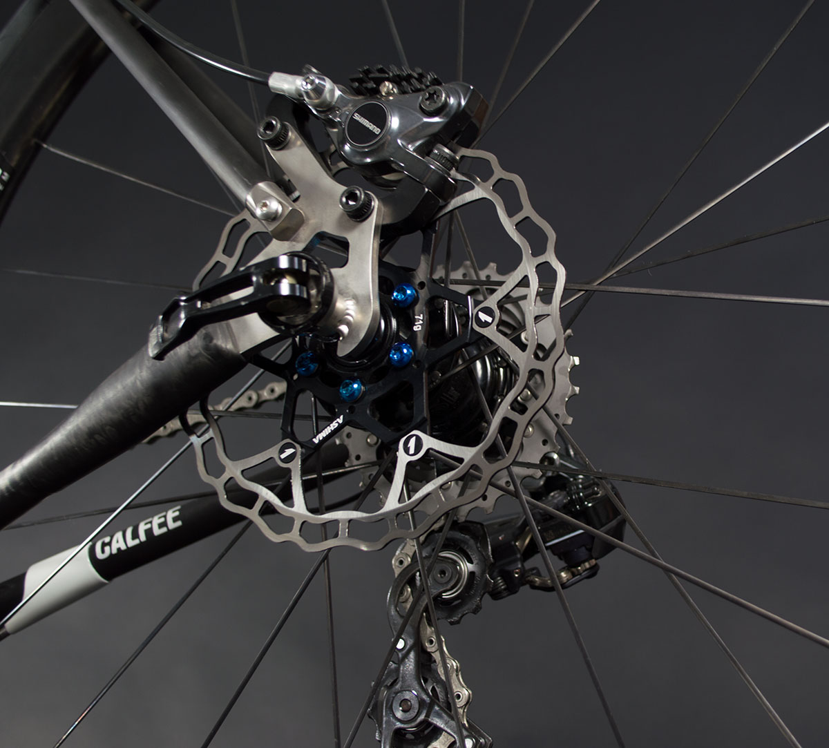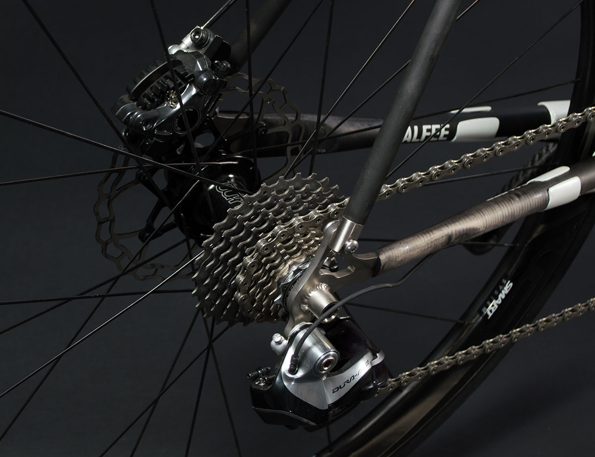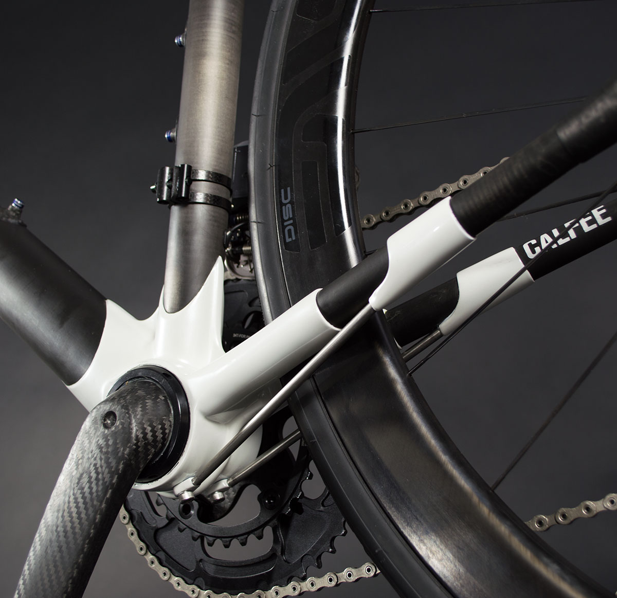 If there’s any doubt to the intended goal of the Manta a simple glance at the bottom bracket can give you some details. Calfee is using Look’s proprietary ZED bottom bracket / crank system. The extremely oversized standard uses a 65mm outer diameter bearing and features a 50mm spindle, 20mm larger than any other road crank on the market. In addition to the bottom bracket the down tube and head tube have been oversized in search of performance the latter being a 1.125-1.5 inch tapered set-up. In addition to the disc brake frame we built the Manta comes in a more traditional rim brake version as well as a Cyclocross set-up with clearance for 35mm tires.