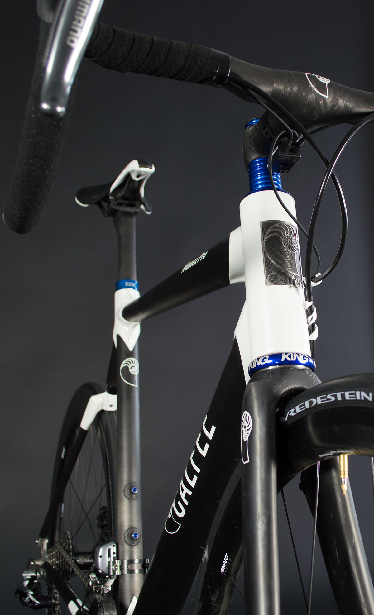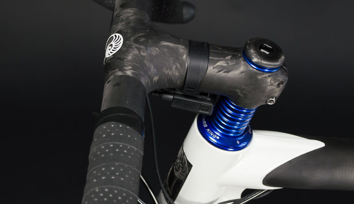 The build out for the bike matches the Calfee’s goals in producing the Manta frame. The base for any build starts with the wheels and ENVE’s SES 3.4 disc rims laced to Tune’s King / Kong hubs are a perfect all around wheel for long days in the saddle. Weight is minimized using Dash’s seat post and a Calfee bonded bar stem combo. The 120g ENVE Stem and 165g MCFK handlebar come in at 259g once they’re wrapped and bonded. Furthermore the R785 Di2 brakes bring Shimano’s mountain bike disc technology to the road. Aside from performance one stand-out feature of the levers is their low profile and small shape. Since the Di2 internals, lacking any mechanical necessity, take up very little space. This way Shimano has more room to integrate the master cylinder and other components necessary for hydraulic lines.