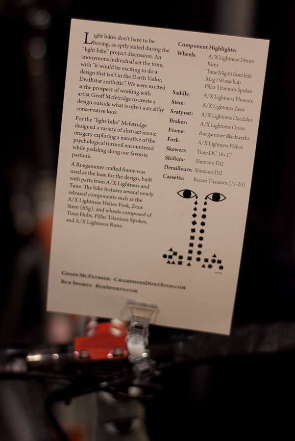 A Ruegammer crafted frame was used as the base for the design, built with parts from A/X Lightness and Tune. The bike features several newly released components such as the A/X Lightness Helios Fork, Zeus Stem (65g), and wheels composed of Tune Hubs, Pillar Titanium Spokes, and A/X Lightness Rims.