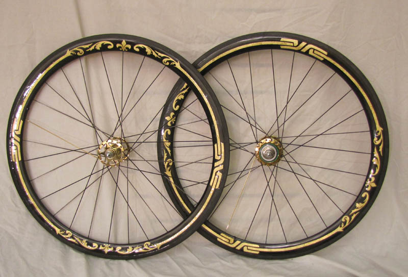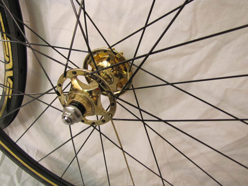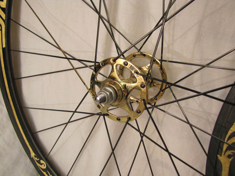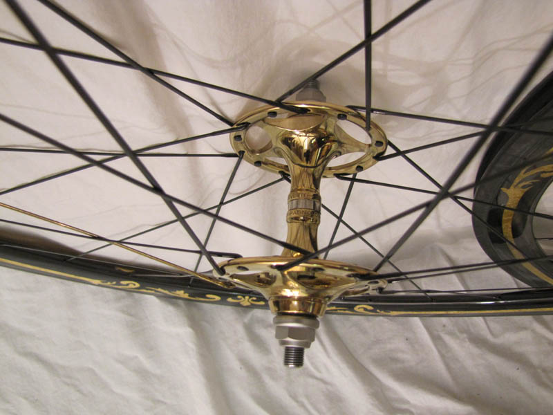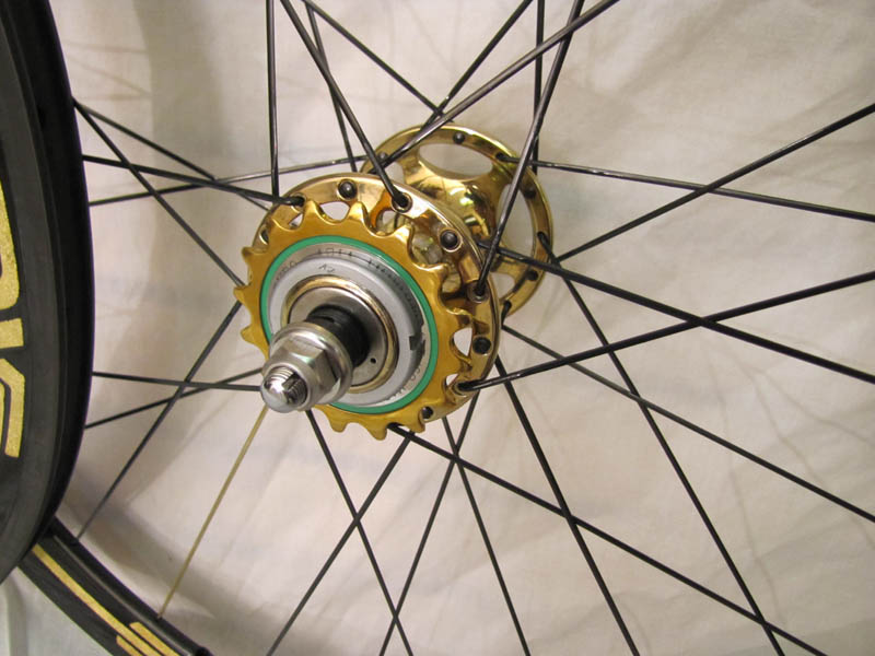 Enve w/ Gold Plated Campagnolo Enve rims with 24kt gold leaf. Hubs: Gold plated Campagnolo Sheriff Star track hubs Spokes: CxRay spokes standard and gold plated