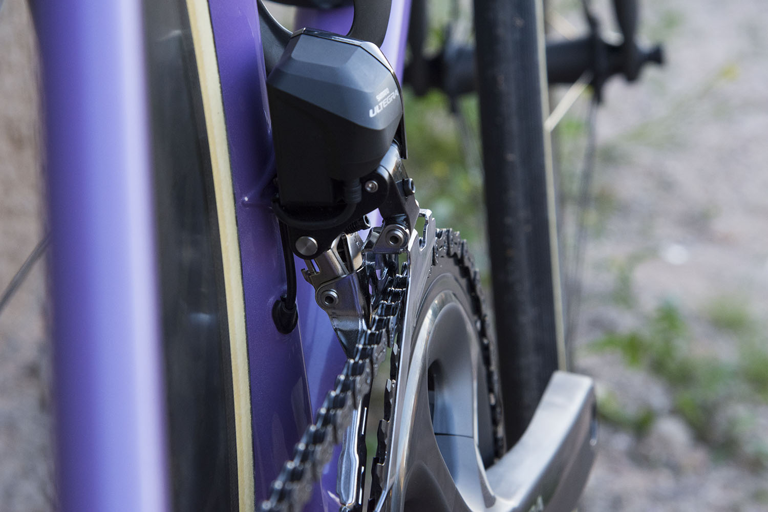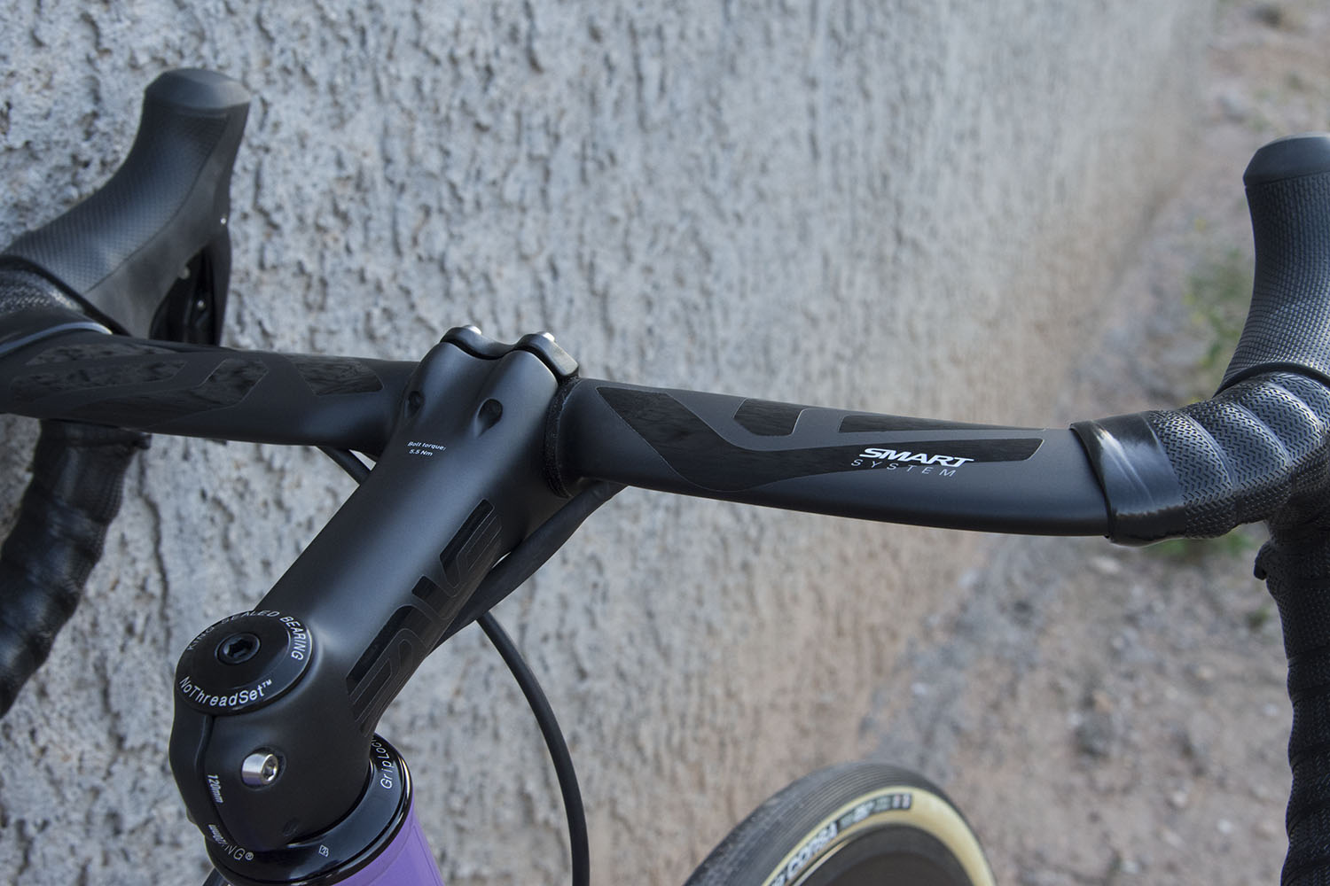 For the build, we wanted to build on Matt’s clean and simple theme by reducing the visibility of the Di2 system. We connected the shifters with a wire routed internally through Enve’s Aero road bars, then routed the right shifter’s wire along the rear brake housing. Using a bit of heat shrink tubing effectively hides the wire while keeping it in place. The front end of the bike has a nearly “wireless” look to it! The main downside of such a setup is that the Di2 A-junction, which must be accessed for charging and adjustment, has to be hidden inside the frame, obviously an inconvenience. Fortunately, the design of the seat mast topper allows for quick access to the seattube where the battery, B-Junction, and A-Junction reside.