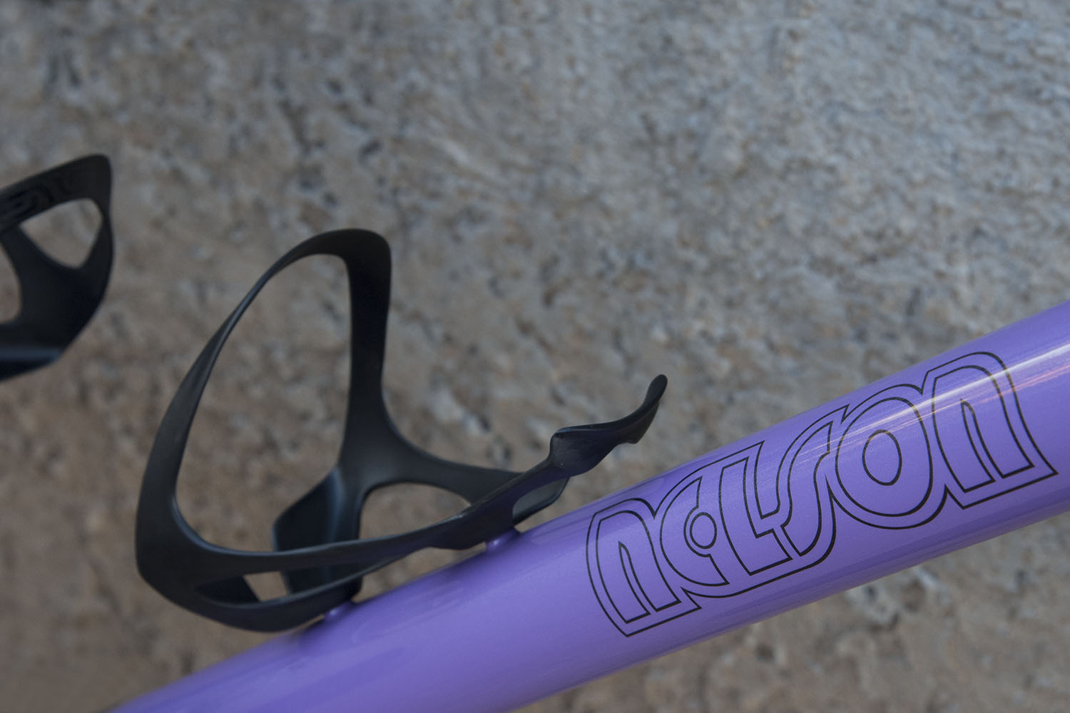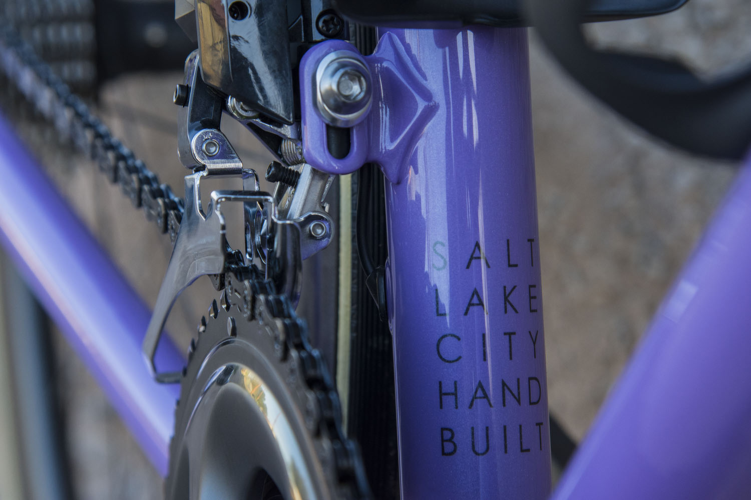 It’s safe to say that Salt Lake City frame builder Matt Nelson (SaltAir Cycles) pulled no punches on this one. As a relatively new builder and first-time NAHBS exhibitor, Matt has shows some impressive skill, creativity and attention to detail with the execution of this unique custom frame. One of the major standouts is the clampless seatmast, which uses a full custom machined aluminum head piece with an internal wedge for a super clean look. Adding to the clean look are the Di2 frame fittings, which include a custom piece on the top tube that accepts both the rear brake housing and the E-tube wire from the shifters. Matt opted for a straight 44mm ID headtube with an external Chris King lower headset to accommodate the Enve tapered carbon fork. Additional features include a threaded BB for simplicity and reliability and “Breezer” style rear dropouts.