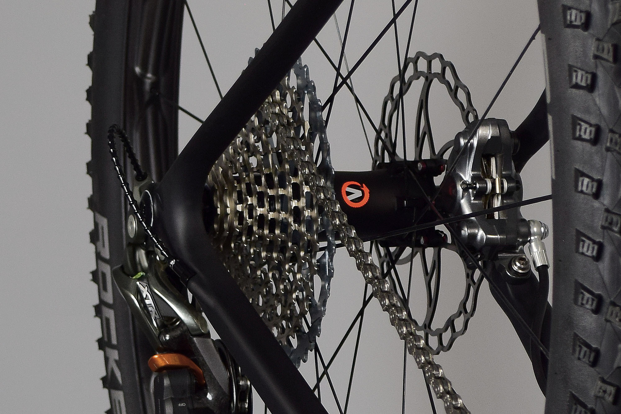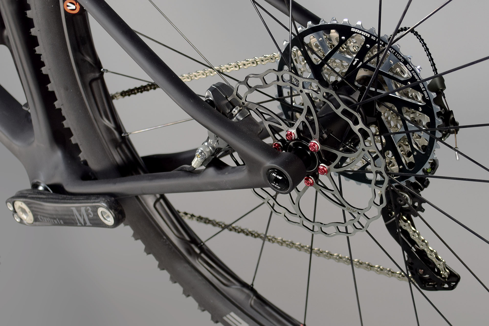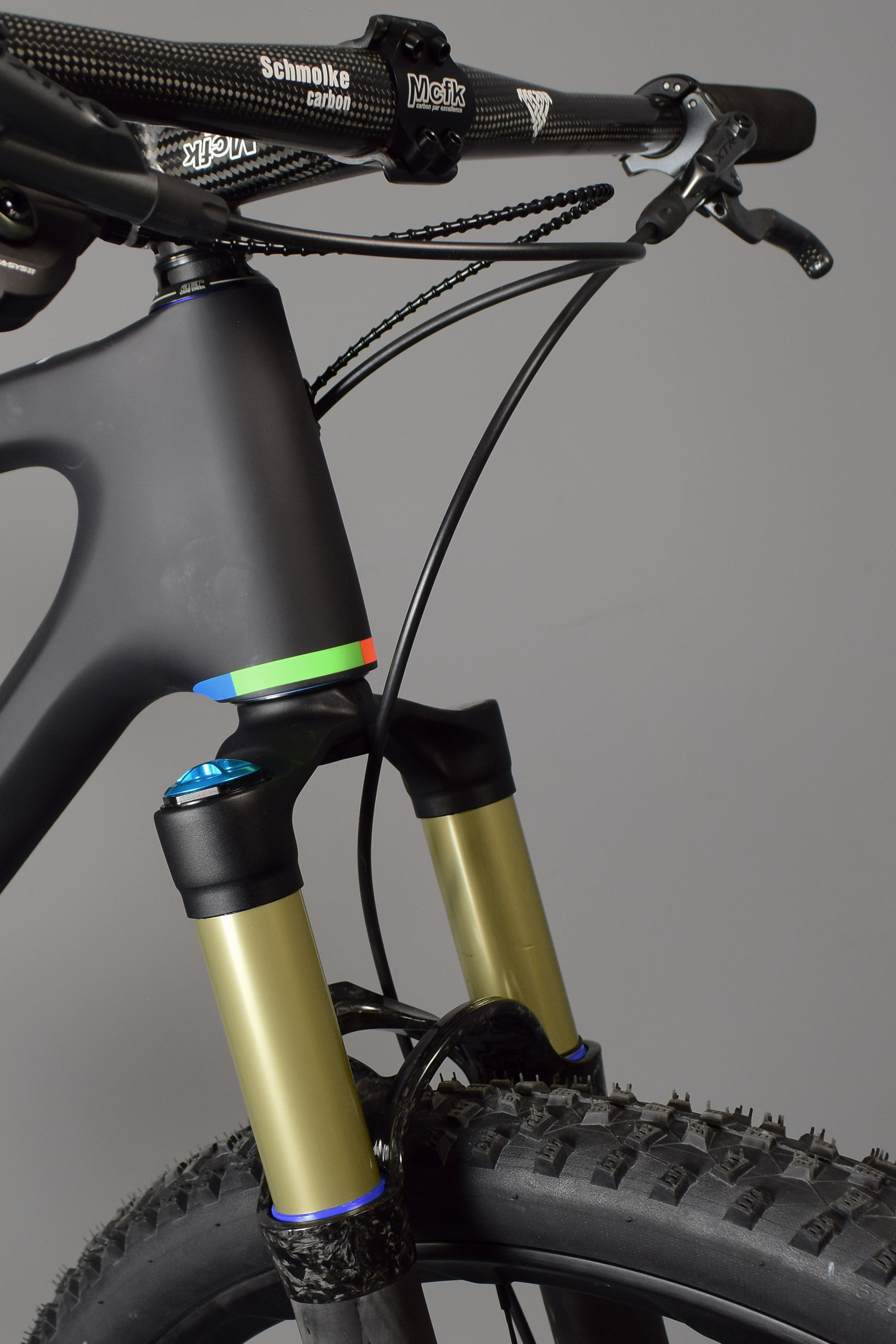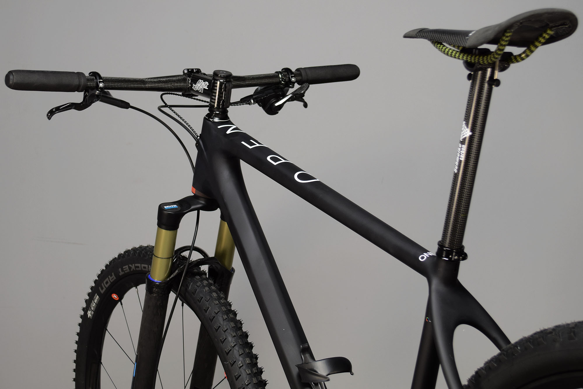 Fork: For mountain bikes, the suspension fork is by far the heaviest single component, with even so-called “lightweight” forks coming in at well over 1300 grams. We opted for the not-so-common German:A Xcite Zero (air sprung), with actual weight at 1102 grams for a 29″ 100mm travel version with 36mm stanchions. Being a relative unknown (especially in the U.S.), this was arguably a risky component choice, but the appeal of saving almost half a pound was too good to pass up.