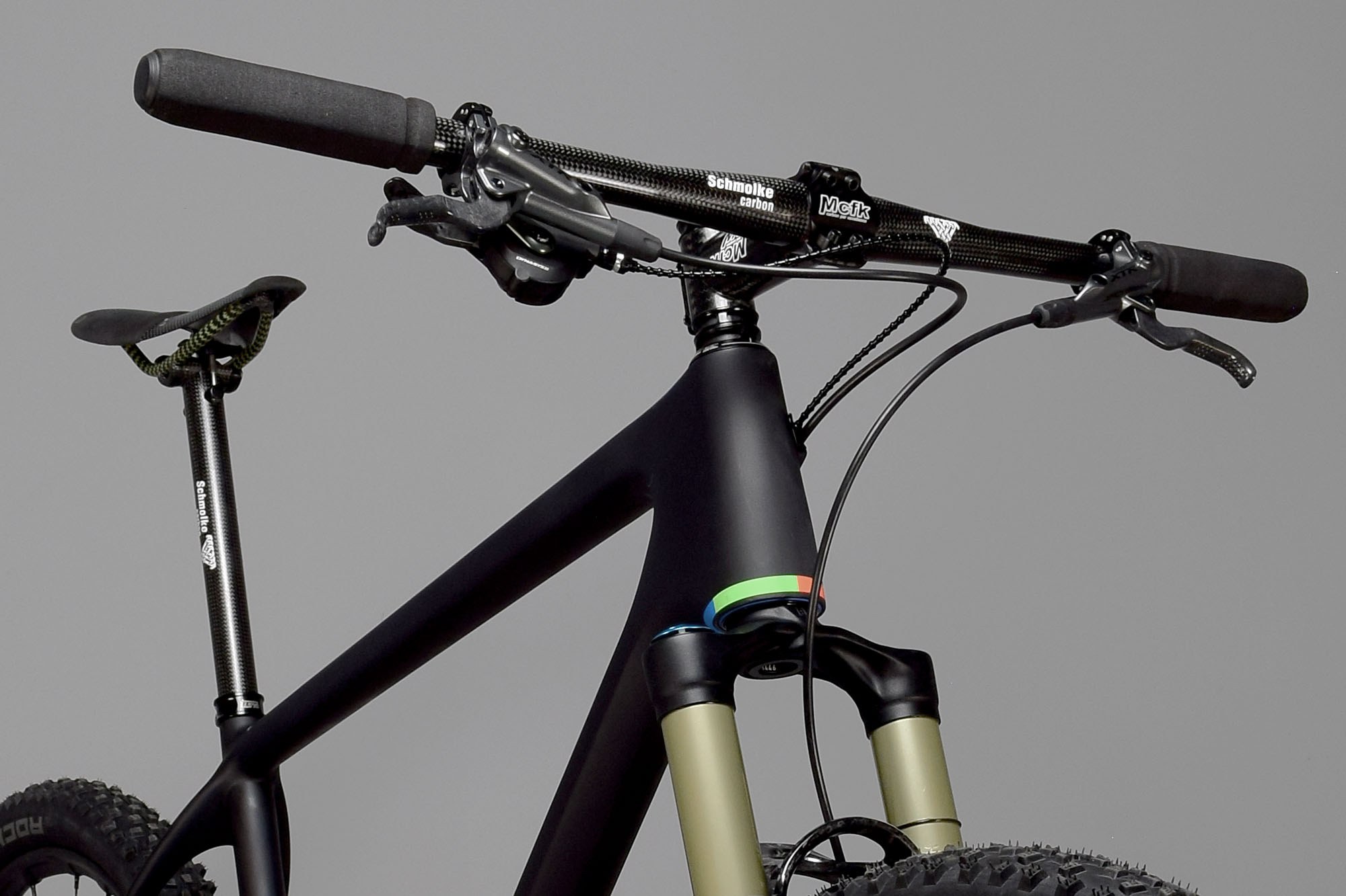 Seating and Cockpit: For the cockpit, we used a combination of Schmolke TLO bars in a 700mm width (93 grams), mixed with a full carbon Mcfk 100mm stem (83 grams.) To complete the rear end of the cockpit, we again chose Schmolke for their TLO 27.2×350 seatpost (97 grams) and the tried-and-true Tune Speedneedle Alcantara saddle (90 grams).
