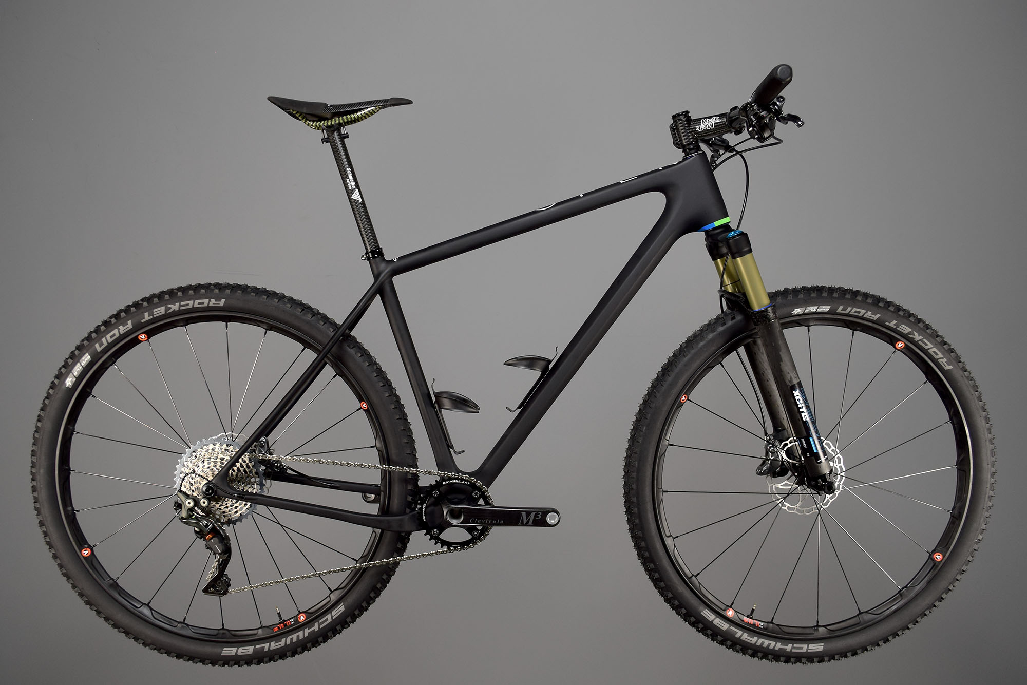 Wheels: As another generally heavy component of an XC race bike, the wheels were also an important factor in this build. We were fortunate enough to have access to a new, yet-to-be-released wheelset from Alchemist. Similar to their RR Marathon wheelset, these are the RR.29. Each full carbon rim uses Alchemist’s Ridge Reinforcement Technology to produce a light and stiff wheelset using their own hubs and Sapim CX-Ray spokes. Actual weight of this wheelset came in at 538 grams front and 709 grams rear. The offset rim design has an internal width of 26mm. The wheels were mated to a set of Schwalbe Rocket Ron 29×2.25 Tires at 585 and 589 grams. Whiskey tubeless tape, Stan’s sealant and KCNC tubeless valves were used to complete the wheelset.