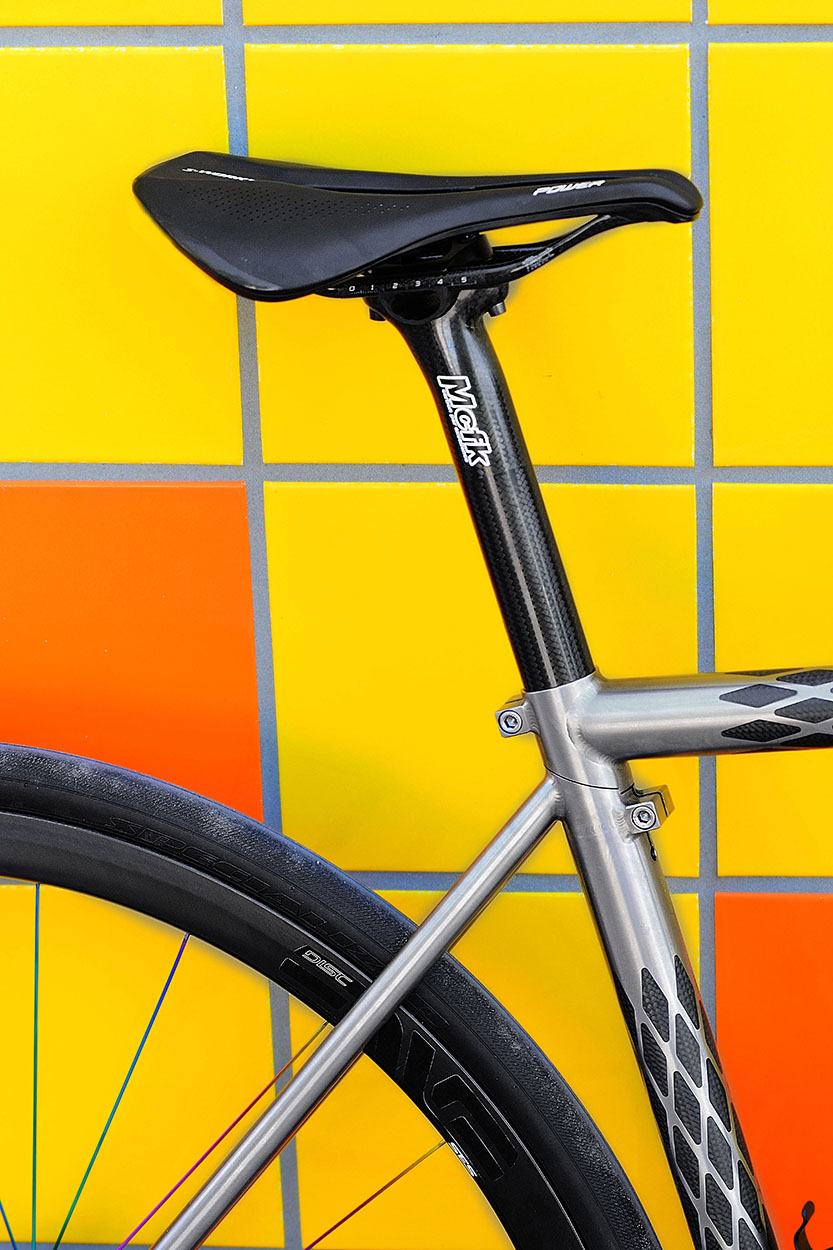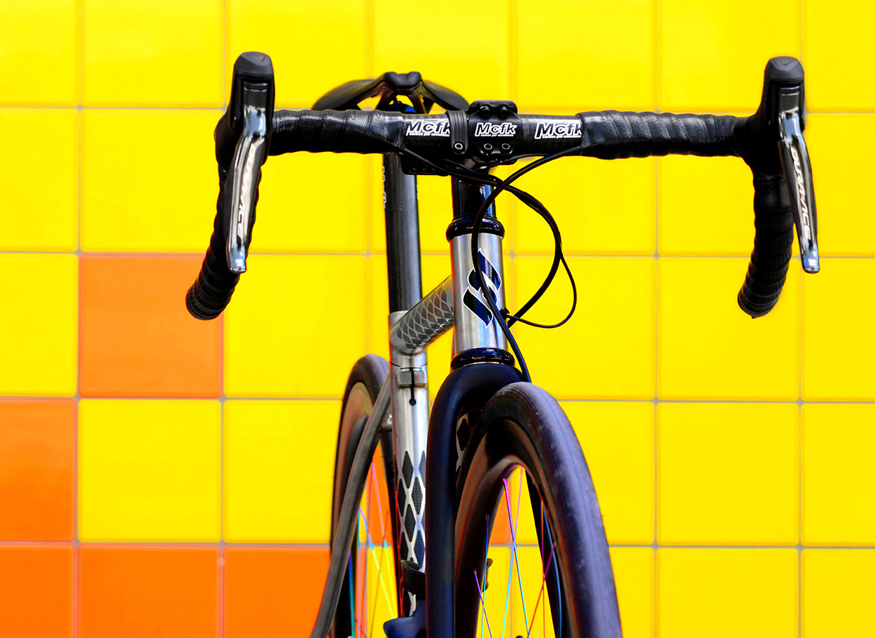 Shimano Di2 Dura Ace Flat Mount Shift/brake, Mcfk Road Handlebar (40cm – 3k Gloss), Lizard Skin DSP Black bar wrap, Chris King Custom Headset