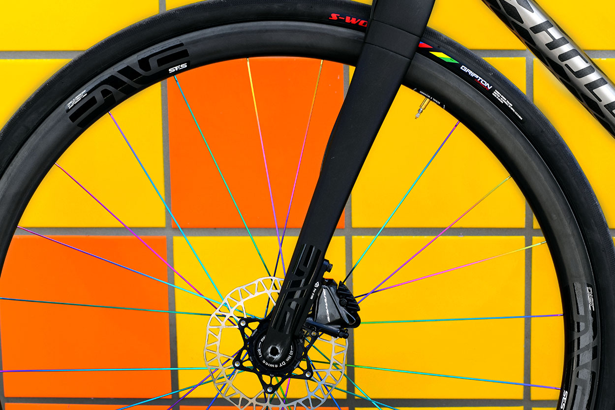 Enve 3.4 Disc Carbon Clincher Rims, Pillar Megalite rainbow spokes, Enve Gravel fork, Dura Ace disc brakes, Kcnc Kasditor Disc Rotors and Specialized S-Works Turbo Tires.